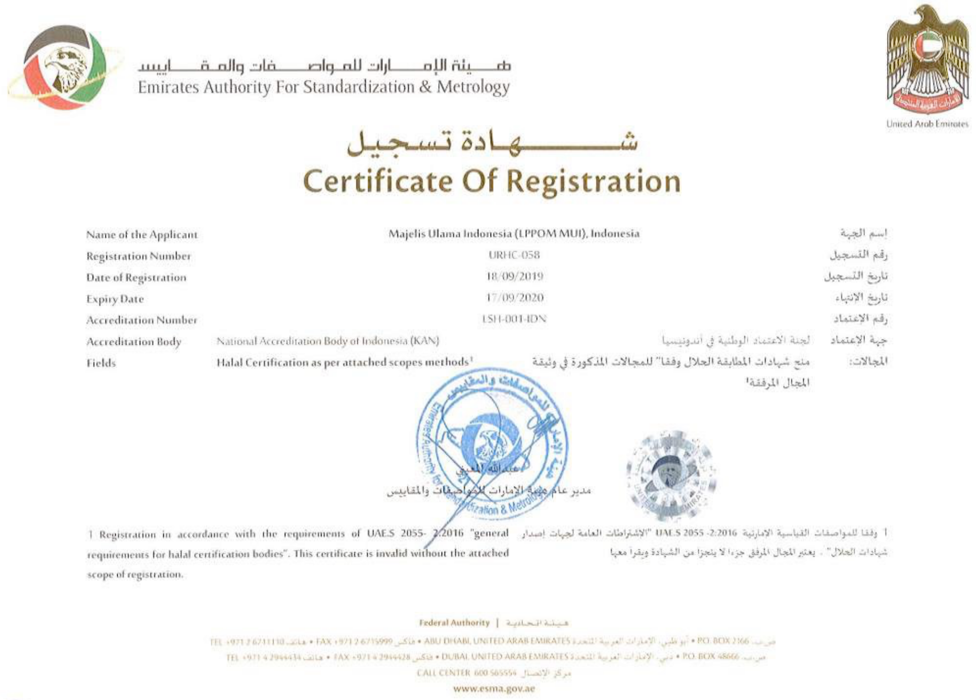 MUI位UAE(阿拉伯聯合大公國)標準局(ESMA)認列的清真標章