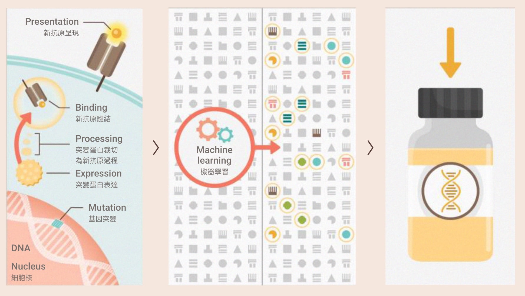 利用二代測序法(next generation sequencing, NGS),我們可以偵測癌細胞與正常細胞有差異的基因突變,利用此基因突變信息,利用全面性新抗原預測模組(comprehensiveneoantigen calculation model),可以預測每一病人癌細胞的新抗原胜肽序列,並將其應用於癌症免疫治療。